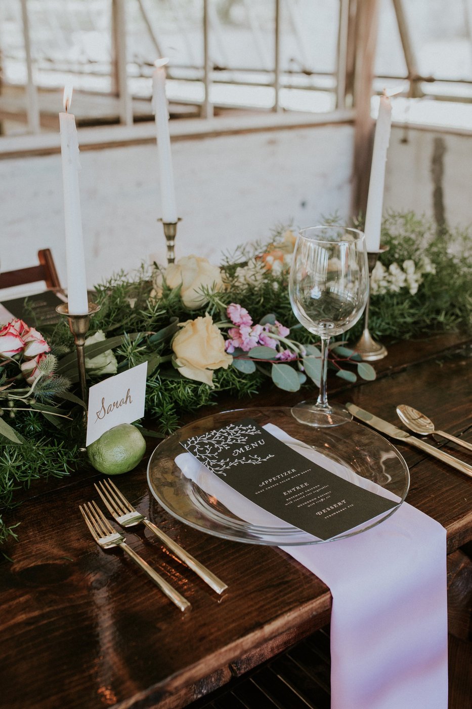 Featured on Ruffled Blog, this editorial shoot was a little bit whimsy, a little bit boho, and a whole lot of color! Jubilee Paper created a whimsical four piece invitation suite inspired by the greenhouse’s trailing ivy. The invitation featured hand drawn illustrations and text, vintage stamps, and a custom pattern. It was all tied together with twine to reflect the rustic surroundings. The color palette included a lush dark green, soft pinks, corals, and yellows. Hand lettered place cards were held by vibrant (real!) lemons and limes, and the dark green menus popped off of the ombre pink napkins and crystal plates. Velvets and cozy neutrals accented the light-filled space resulting in a look that was elevated yet down to earth. A big thank you to the incredible florals by Rosemary & Rust and Sandra L. Porterfield, beautiful photographs by Sarah Brookhart and Jenna Brianne, and the lovely Historic Shady Lane venue!